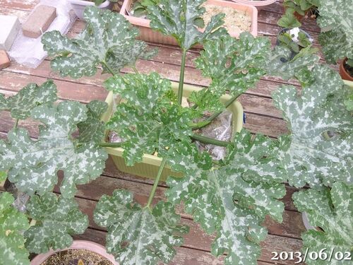 58日目その1 てんとう虫が転居された模様、アブラムシは少し減ってきたけどまだ居るんだよなあ 右側の雌花は明日辺り開花しそう、左の雄花も同時に咲いてほしい 株の直径 うーんデカイ 58日目その2と40日目のスイカ 40日目 34日目たち、せまい