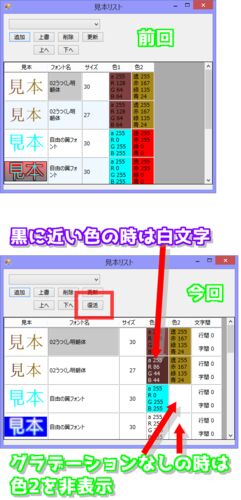 昨日 gogowaten.hatenablog.com 文字の描画のレイアウト変更 見本リストの一覧表で クリックで設定に反映するようにした コンボボックスの項目を同期するようにした 色1と色2のARGBの各数値を表示するようにした その他調整 文字の描画タブを二つのタブに分…