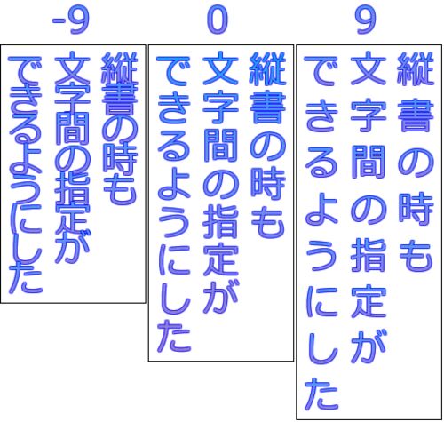 昨日の続き gogowaten.hatenablog.com 文字の描画で縦書でも文字間指定ができるようにした 左から文字間の指定が-9,0、9それぞれで描画した場合 0以外の時は1文字づつ描画しているのでグラデーションも文字列全体ではなく 1文字づつになってしまうのは横書…