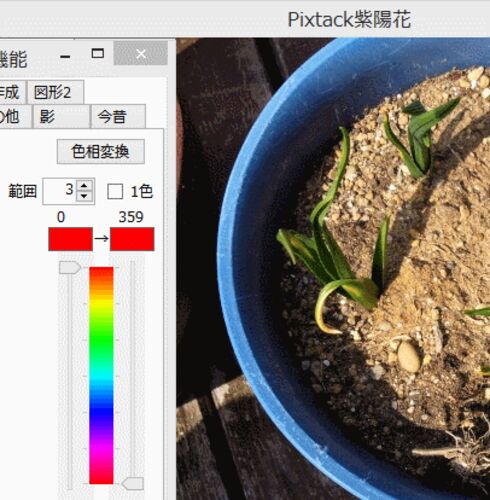 昨日の続き gogowaten.hatenablog.com 色変化で色相変化させた画像も保存できるようにした 色相を移動するのと指定色相にするのを選択できるようにした http://www.geocities.jp/gogowaten/pixtack_animation63.gif 色相204(水色に近い青)から範囲20ぶんを色…