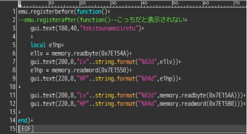 MeryのLua用構文ファイルをいじって ゲームのエミュレータ用の文字を加えた 相変わらずこれであっているのかわからないけど目的のことはできたのでメモ 適用すると ↑これが↓こうなる エミュレータ用の文字列に色がつくので文字の打ち間違いに気づきやすくな…