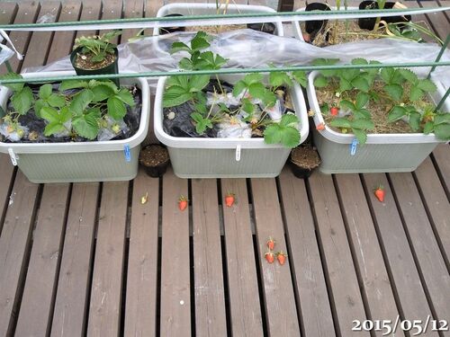 昨日の収穫と廃棄 一番右のものくらいの大きさが採れるのが理想 中央の3つは張りがなくて少しぶよぶよしている 一見まともに見える一番右のものでも一部が腐っている 上から見るとがくに黒い斑点がある、イチゴを腐らせる原因と同じだと思われる 減ってきた…