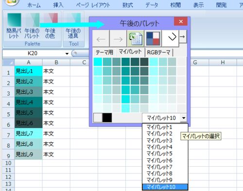 前回 gogowaten.hatenablog.com の続き 午後のパレットのマイパレットを5から10枚に増やした エクセル2007より前のエクセルのパレットを再現したものを マイパレット9に登録してみた 懐かしい色の配置だなあと思っていたら 2007でもあって、コメントの書式設…