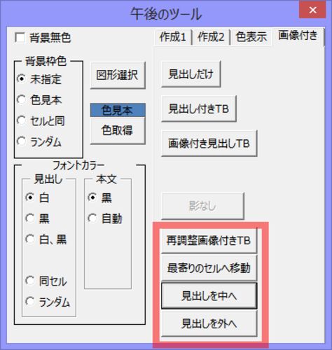 前回 gogowaten.hatenablog.com の続き 午後のツールの画像付きタブに赤枠のボタンを追加 再調整画像付きTB 見出しと本文用の図形のサイズと位置を再調整 画像の幅に合わせる 位置は見出しに合わせる このボタンの詳しい内容は gogowaten.hatenablog.com 選…