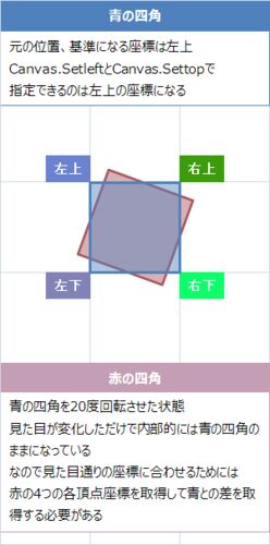 回転後のコントロールをマウスドラッグ移動するときに グリッド移動(グリッドスナップ) グリッドスナップする頂点は四角形の各4頂点すべての中で一番グリッドに近いもの この条件での処理がなんとかできた感じ wpf_37.gif 回転していない四角形の移動は今のP…