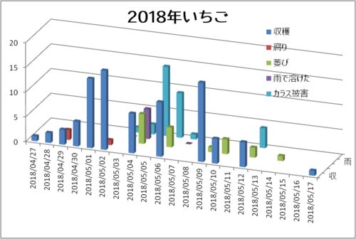 2018年いちごの収穫まとめ 収穫が食べることができた個数 それ以外は廃棄個数 割合 カラス被害が大きかった 31個は確認できた個数で実際は70個以上の被害だと思う 今年は雨が多かった 折れ線が累計 去年の倍以上降って雨や曇りの日が多かった 去年の雨除け …