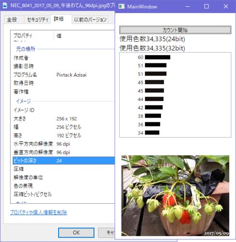 画像の使用色数と使用数が多い上位10色を表示 起動したところ ここに画像ファイルをドロップする 画像は 普通の写真画像、サイズは1024x768 これをドロップで 使用されている色数が表示される この画像は86151色だった カウント開始ボタンを押すと 使用され…