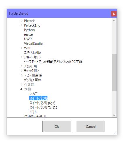 WPFなのにバインディング要素なしだけど、動けばいいんだよ 前回の gogowaten.hatenablog.com これを利用して作ったのが これ フォルダ選択ダイアログ 見た目の変化は、okとキャンセルボタンをつけただけ FolderDialog.xaml