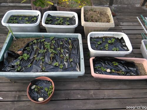 昨日のいちご マルチングの作業する準備として 枯れてきた古い葉っぱを取り除いた。風はだんだん収まってきたけどマルチングの作業にはできそうになかった 今日、2019/12/09 風は1~2m/sくらい、これなら十分 マルチングの作業開始 このプランターにいちごを…