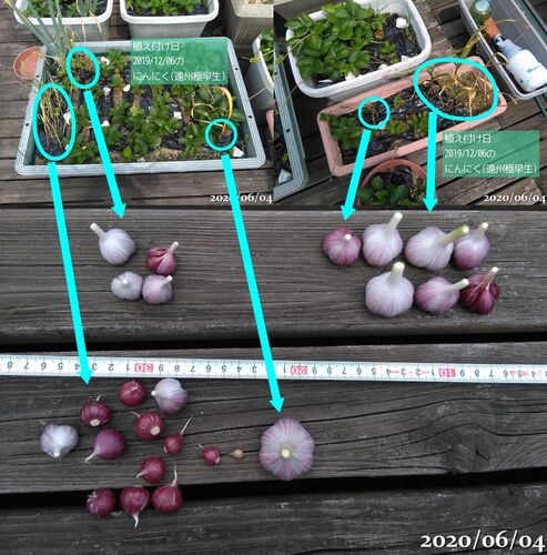 前回の収穫時の様子 youtu.be 12月6日に植え付けしたにんにく(遠州極早生)の収穫 この2つのプランター元はいちごを植えていたけど枯れてしまって、空いたところに余っていたにんにくを植えた場所 植え付け日の12月6日ってのは普通より1ヶ月以上遅いタイミン…