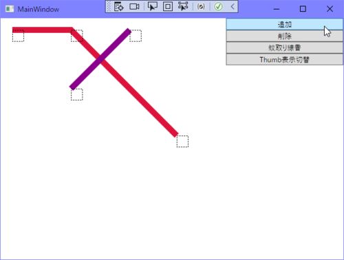 前回の WPF、PolyLineの頂点にThumb表示、マウスドラッグで頂点移動 - 午後わてんのブログ これを少し書き直してみた 20220613_WPF、PolyLineの頂点にThumb00.png ついでに、ThumbのTemplateを変更して塗りつぶしなしの点線枠にした コード 2022WPF/20220610…