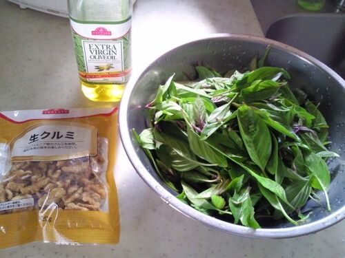 シナモンバジルペースト作りに挑戦 バジルの葉っぱは水気を切ったほうがいいらしいけど面倒だからこのまま 量は適当、家には計りがないから、いつも目見当 クルミは約60グラム、オリーブオイルが約150グラム にんにくがこれくらい クルミとにんにくをフード…