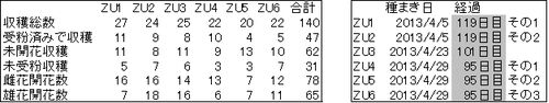 ZU1ZU2ZU3ZU4ZU5ZU6合計ゴウケイ 種タネまき日ビ経過ケイカ 収穫総数シュウカクソウスウ261919171420115ZU12013/4/5111日目その1受粉済ジュフンズみで収穫シュウカク1198104547ZU22013/4/5111日目その2未開花収穫ミカイカシュウカク104647839ZU32013/4/2393…